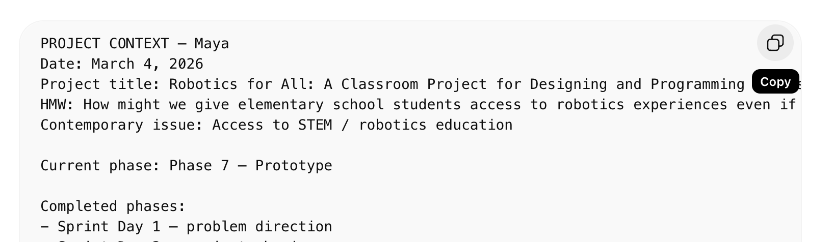 - Paste your context handoff from the previous phase. This is a block of text that summarizes where you are, what you've decided, and what comes next. If this is your first time, just introduce yourself and say which phase you're starting.